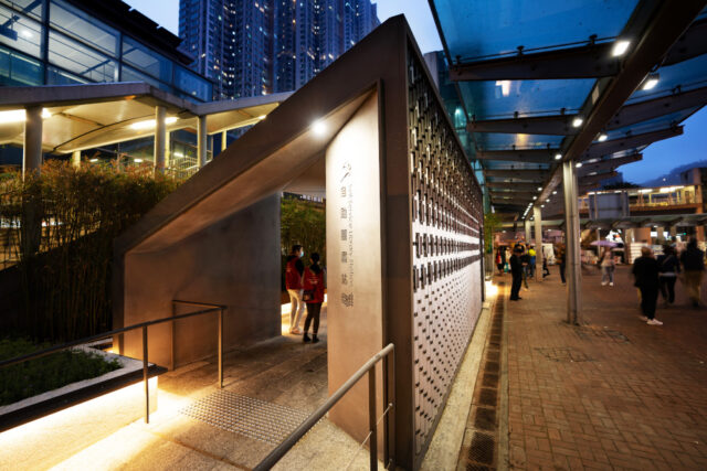 Tai Wai Self-service Library Station is situated in the heart of residential area and right next to the Tai Wai MTR station Exit D. It offers the local community with 24-hour borrow and return service. Instead of being a loud architecture, the library station takes a subtle form which is integrating into the neighbourhood. Silver aluminium corrugated sheets are curved with the shape of an “opening book”; while prefabricated concrete panel is used for the interior. The brutalism style of library station creates an interesting dialogue with the busy urban scene.