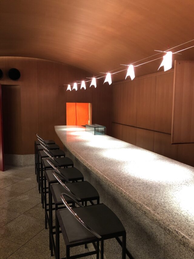 When you look up, there are two vaulted ceilings with diffusing the warming lighting, extending from the wall behind the bar. Another one is the use of acrylic sheet to diffuse lighting to the bar table. The sushi bar was built by Kuramata, with collaborating with Ishimaru Co., Ltd.